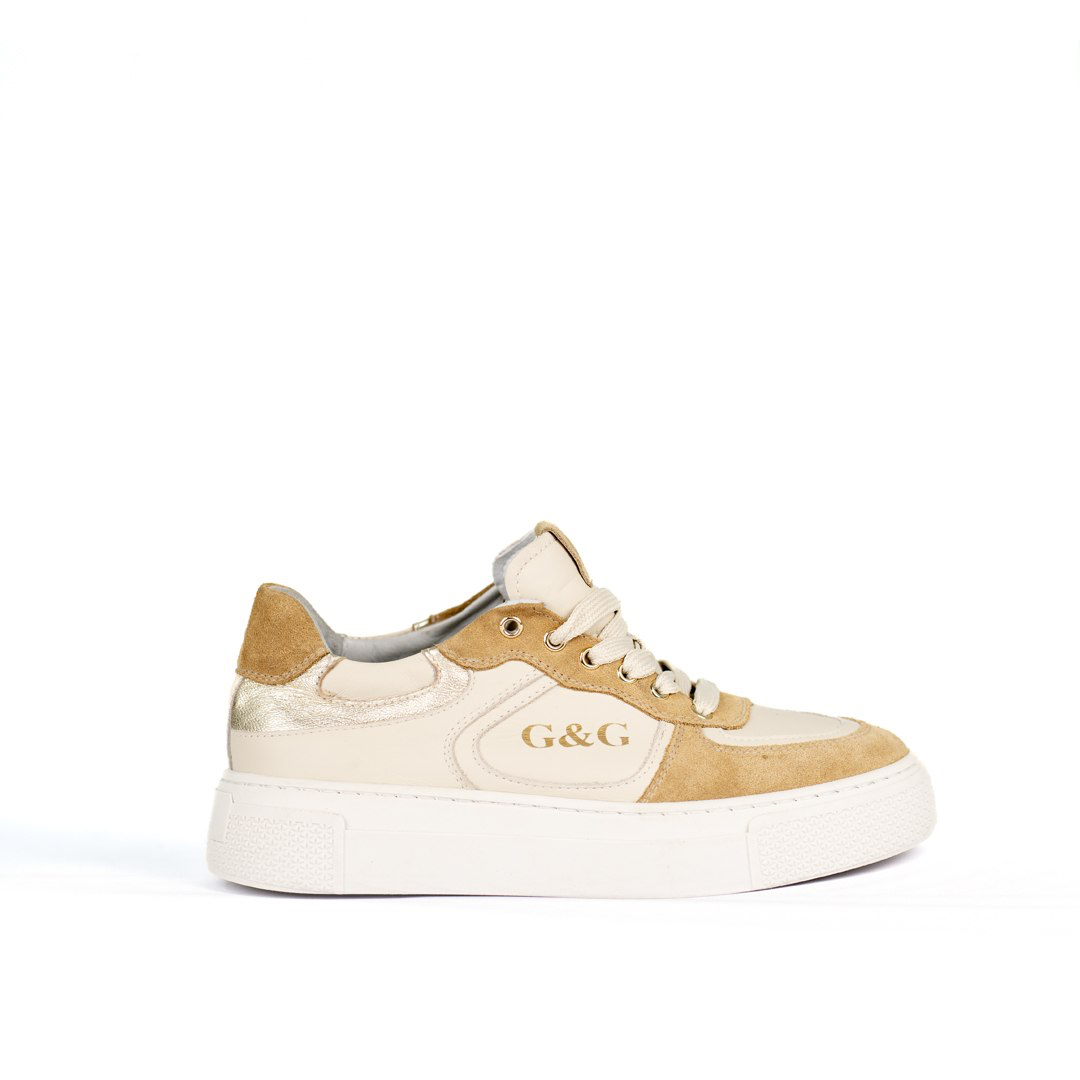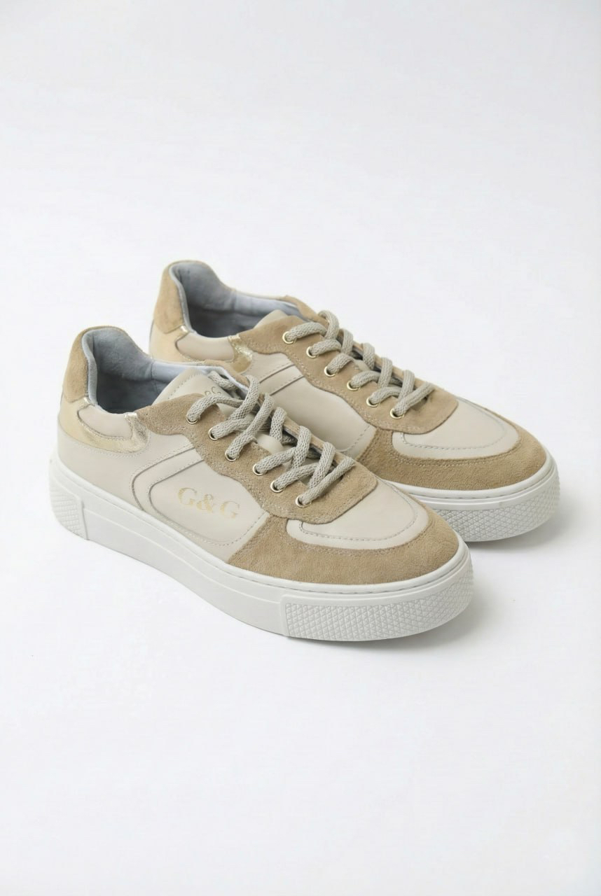 Modern-style sneaker crafted from leather and suede in elegant beige tones. Featuring a clean design with front lace-up closure and a thick sole that ensures comfort and stability. Ideal for a casual-chic look, perfect for everyday wear.