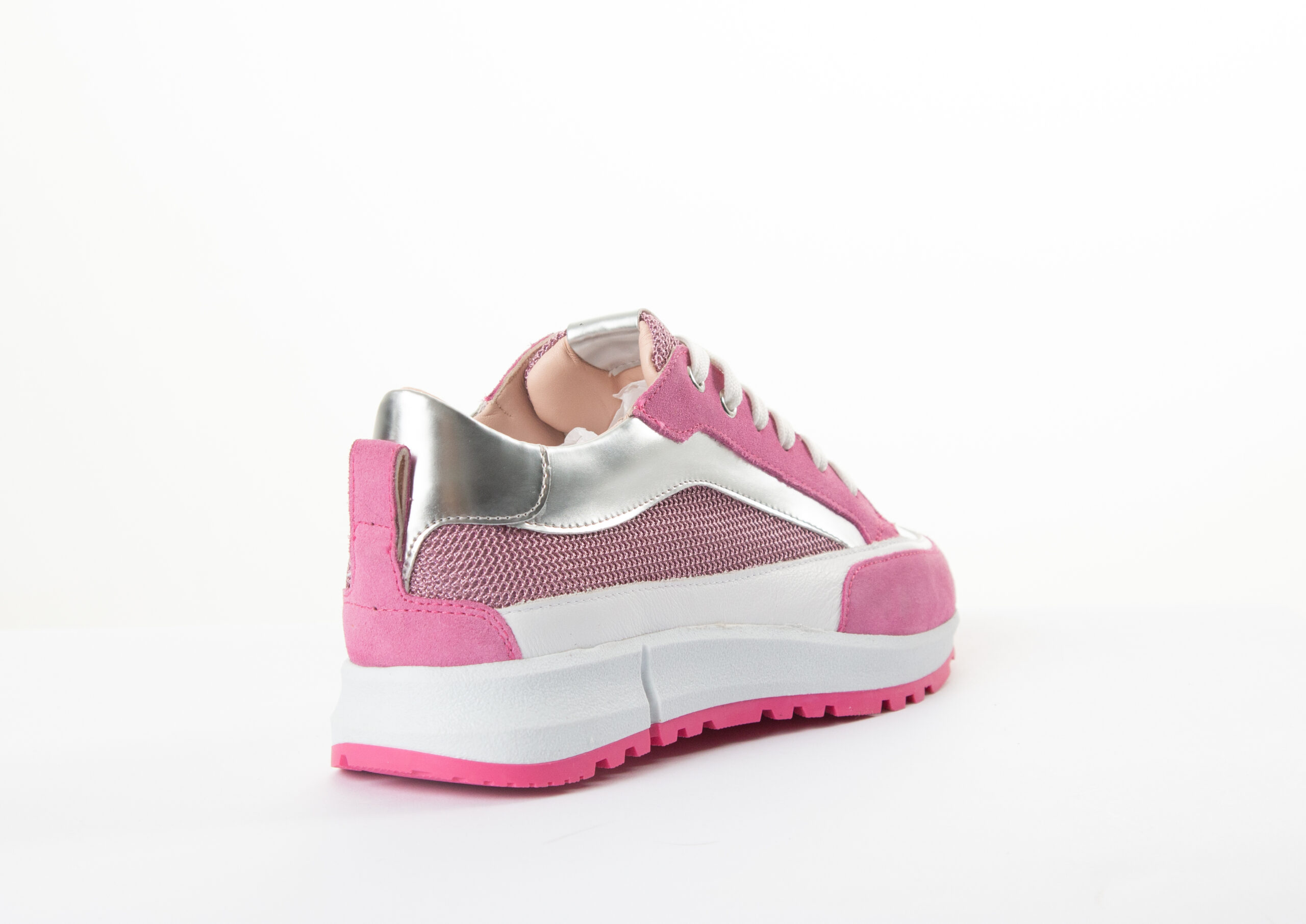 Women’s sneaker with a modern and sporty design, featuring an elegant mix of pink, white, and silver details. The upper combines synthetic materials and breathable fabric to ensure comfort and lightness throughout the day. The thick non-slip rubber sole provides stability and optimal cushioning. Perfect for a casual, urban, and dynamic look, ideal for everyday wear. ✨