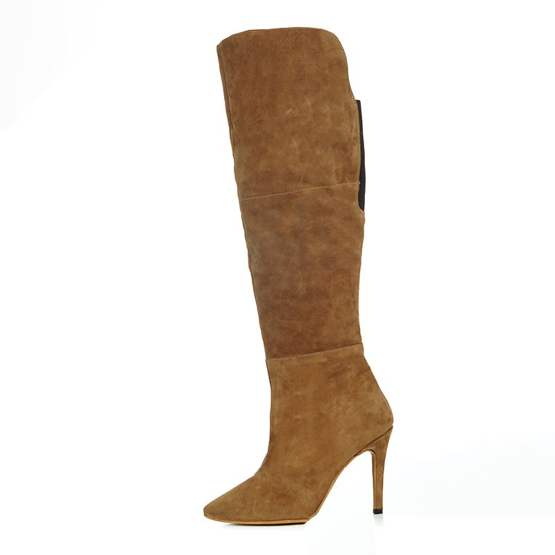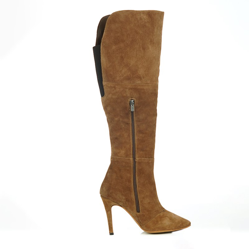 Over-the-knee boot crafted in soft caramel-colored suede, featuring a refined and seductive design.