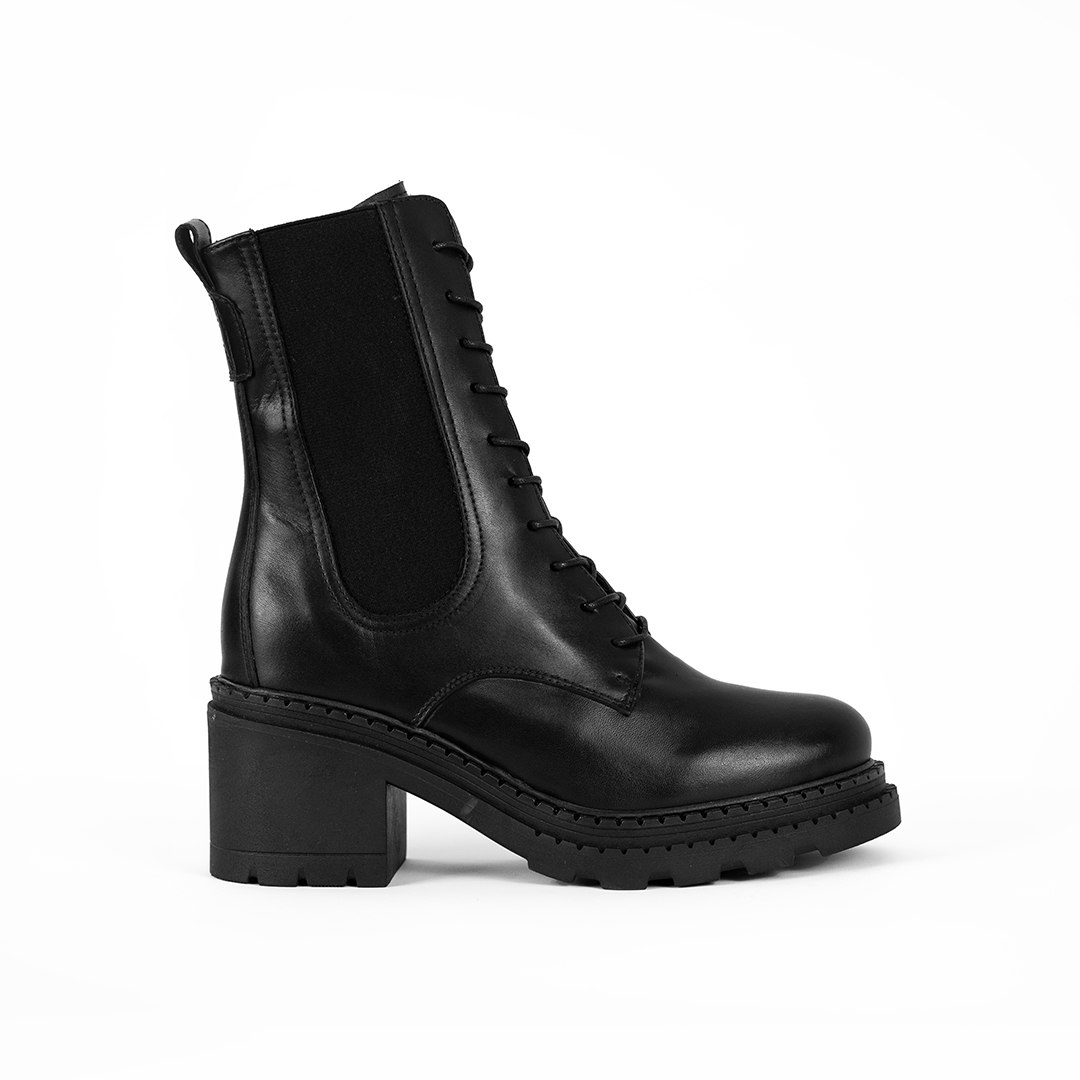 Black ankle boot with a structured and contemporary design, ideal for a woman who loves a bold yet refined style.